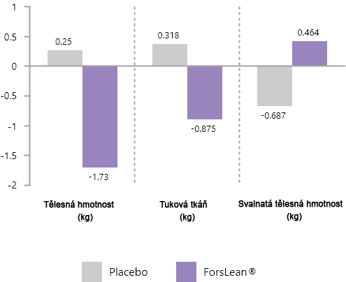 Účinnost ForsLean® byla potvrzena klinickým hodnocením provedeným metodou dvojitě zaslepené studie, kdy po 12 týdnech užívání 250 mg ForsLean® došlo u testovaných osob k významnému snížení tělesné hmotnosti a obsahu tuku a k významnému nárůstu svalnaté tělesné hmotnosti v porovnání se skupinou užívající placebo.